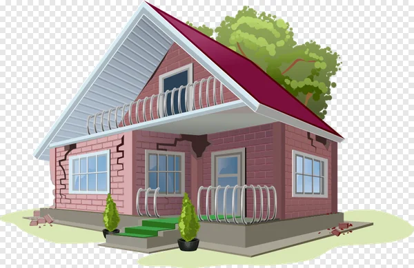 Download this high-quality free PNG of a dilapidated brick house illustration with a transparent background. This detailed graphic showcases a two-story building featuring prominent cracks in its red brick walls, scattered broken bricks around the foundation, and a distinctive dark red roof. The house includes multiple windows, a charming balcony, and a front porch, both adorned with unique spiral coil railings. Green steps lead up to the porch, flanked by two potted evergreen plants, adding to the visual appeal of its neglected state. Ideal for projects related to home repair, renovation, property damage, real estate issues, conveying a sense of age, or illustrating neglect. Enhance your presentations, websites, or educational materials with this unique house graphic!