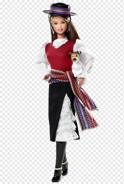 Unleash your creativity with this stunning free PNG of a Barbie doll, beautifully dressed in a vibrant Spanish flamenco-inspired outfit. This collectible doll features a wide-brimmed matador hat, an elegant red knitted vest over a white ruffled blouse, a black skirt with delicate white lace peeking out, and a colorful woven sash. Completing her look are glossy black boots, and she holds an adorable small brown and white dog. Perfect for graphic design projects, presentations, fan art, educational materials, or simply to admire. Download this high-quality transparent image today and add a touch of Spanish charm to your work!