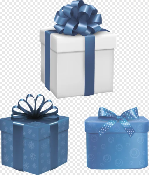 Download these beautiful, high-quality PNG gift boxes for free! This versatile collection features three distinct presents: one elegant white box with a vibrant blue fluffy bow, another charming blue box adorned with delicate snowflakes and a silky blue ribbon, and a third delightful blue gift box featuring a playful polka-dot bow and subtle circle patterns. Perfect for adding a festive touch to your holiday designs, birthday invitations, thank you cards, promotions, or any digital project. Each image comes with a transparent background, making integration seamless. Get your free gift box PNGs today and elevate your creative work with these joyful celebration graphics.