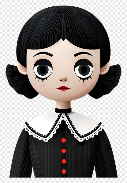 Download this captivating free PNG image featuring a stylized gothic doll cartoon girl. She sports striking big black eyes, a classic textured black bob haircut with unique pigtails, and a pale complexion with subtle pink blush. Dressed in a chic black, striped outfit adorned with a charming white Peter Pan collar detailed with elegant black lace trim and four vibrant red buttons, this illustration offers a unique blend of cute and eerie. Perfect for Halloween designs, whimsical projects, invitations, profile pictures, or adding a distinctive touch to your digital art. Get this high-quality, transparent background PNG for your creative endeavors today!