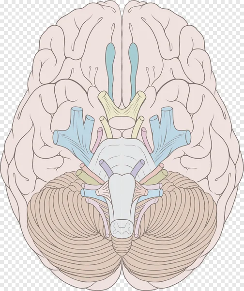Tags: anatomy biology brain brainstem cerebellum cerebrum cranial nerves diagram education human brain medical illustration medulla oblongata neuroscience olfactory nerve optic chiasm pons science transparent PNG trigeminal nerve ventral view