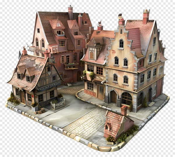 Download this captivating, high-quality free PNG image featuring a detailed isometric old town street scene. This European village illustration showcases charming medieval-style buildings with intricate architecture, terracotta roofs, dormer windows, and cobblestone paths. Perfect for game developers seeking fantasy or historical assets, graphic designers, digital artists, or anyone needing a unique backdrop for their projects. The transparent background makes integration seamless into any design. Enhance your creations with this beautiful, pre-rendered village cluster – available for instant free download and commercial use!