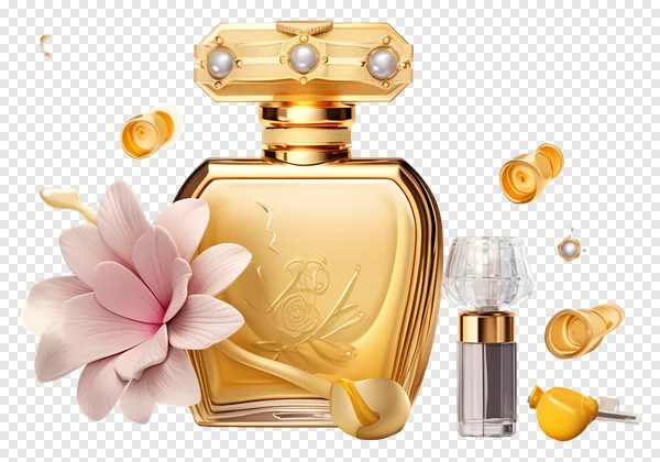 Discover our exquisite free PNG of a luxurious golden perfume bottle, featuring an ornate cap adorned with lustrous pearls and delicate rose engravings. A vibrant pink magnolia flower adds a touch of natural elegance, beautifully complemented by shimmering golden liquid droplets, creating a sophisticated and glamorous aesthetic. Perfect for high-end beauty blogs, cosmetic advertisements, graphic design projects, or any visual content requiring a touch of luxury. Download this transparent background PNG today and elevate your designs with this stunning, detailed image!