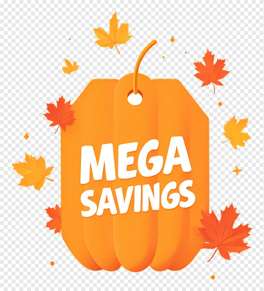 Download this vibrant 'Mega Savings' pumpkin price tag PNG image for free to enhance your autumn promotions! Featuring bold white text on an orange pumpkin-shaped tag, surrounded by beautiful falling red and yellow maple leaves, this transparent background graphic is perfect for announcing special discounts, seasonal sales, and exciting deals. Ideal for e-commerce banners, social media posts, flyers, or website headers during fall, Halloween, or Thanksgiving seasons. Get ready to boost your marketing campaigns with this eye-catching, high-quality fall sale design. Click to download and start saving!