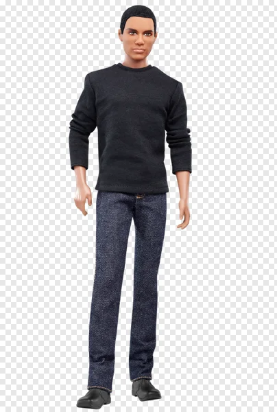 Download this high-quality free PNG image featuring a stylish male fashion doll, reminiscent of a modern Ken doll. The doll sports a casual yet chic look with a black long-sleeved crew-neck shirt, dark blue denim jeans, and black shoes. His medium-dark skin tone and short dark hair add to his contemporary appeal. Perfect for graphic design projects, educational materials, children's content, presentations, or adding a friendly, modern touch to any digital creation. Get this transparent background image for your projects today!