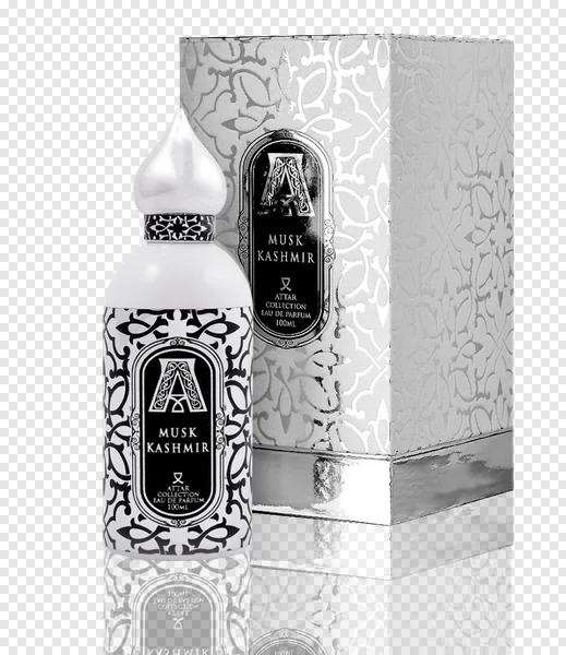 Download this stunning, high-quality PNG of Musk Kashmir Attar Collection Eau de Parfum for free! Featuring an elegant black and white bottle with an ornate pearl-like cap and its beautifully patterned silver box, this luxury fragrance image is perfect for e-commerce, beauty blogs, graphic design projects, or creating captivating visuals. Get this transparent background perfume render and add a touch of sophisticated oriental charm to your designs. Ideal for showcasing premium products.