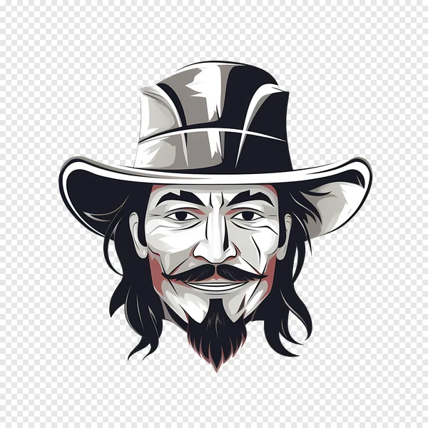 Download this striking free PNG of a mysterious masked man, perfect for adding a bold and iconic touch to your designs. This high-quality vector illustration features a vigilante-style character reminiscent of Guy Fawkes or 'V for Vendetta', complete with a distinctive wide-brimmed hat, long flowing hair, a sharp mustache, and goatee. Ideal for graphic design projects, avatars, social media, merchandise, or digital art. The transparent background ensures seamless integration into any creative work. Get your free download today and let this enigmatic figure inspire your next project!