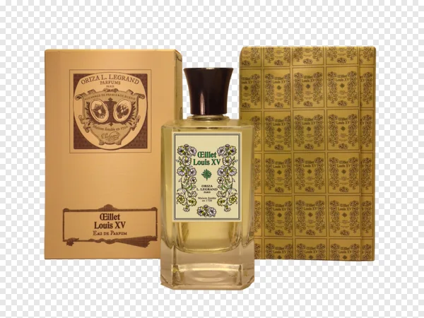 Download a high-quality PNG of the exquisite Oriza L. Legrand Œillet Louis XV Eau de Parfum. This free image features the elegant perfume bottle with its distinct floral label, alongside its beautifully designed vintage box and ornate patterned packaging. Perfect for luxury brand presentations, fragrance reviews, beauty blogs, graphic design projects, or adding a touch of classic French sophistication. Get this premium, transparent background image for your creative needs today and showcase the timeless appeal of this historic fragrance.