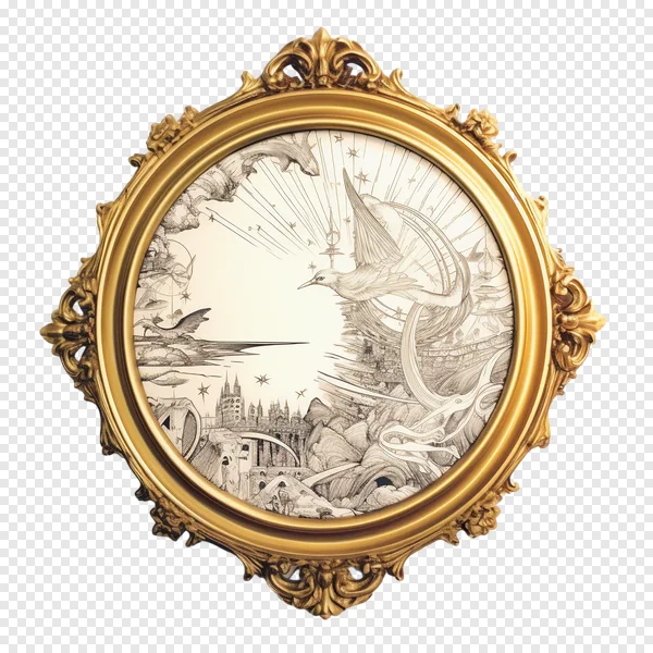 Download this captivating free PNG featuring a stunning, ornate golden frame encircling an intricate monochrome fantasy illustration. This highly detailed sketch showcases a surreal world with a majestic bird in flight amidst radiating lines, elaborate steampunk-esque structures, a sprawling spired castle city, and mysterious, mountainous landscapes. Perfect for adding a touch of vintage elegance, fantasy, or unique artistic flair to your graphic design projects, presentations, or digital collages. Its high-quality resolution and transparent background ensure versatile and seamless integration into any creative endeavor. Get your free download now and explore this fantastical dreamscape!