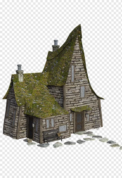 Enhance your creative projects with this charming rustic stone cottage PNG, available for free download! This unique fantasy dwelling features a striking multi-gabled roof completely covered in lush green moss, sturdy stone walls, two detailed brick chimneys, and quaint latticed windows. A welcoming wooden door with a small porch and a winding path of stepping stones add to its picturesque appeal. Ideal for game developers, graphic designers, digital artists, or anyone looking for a whimsical, old-world structure. Its transparent background ensures seamless integration into any scene. Perfect for fantasy landscapes, story illustrations, or desktop wallpapers. Download now to add a touch of ancient magic to your designs!