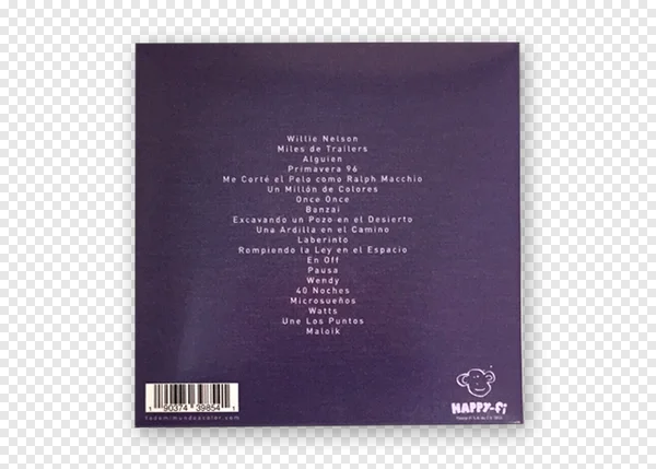 Download this high-quality free PNG of a Spanish album's back cover. Featuring a detailed tracklist of 18 song titles in white text against a dark purple background, a standard barcode, and the distinctive HAPPY-Fi record label logo, this image is perfect for music enthusiasts, graphic designers, or anyone needing a realistic CD artwork element. Use it for mockups, presentations, or digital projects. Get your free transparent PNG download now for personal and commercial use!