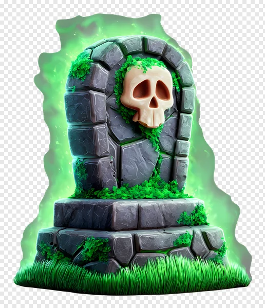 Unearth this enchanting, free transparent PNG of a stylized fantasy gravestone! Featuring a hauntingly beautiful glowing green aura, a whimsical cartoon skull, and intricate moss-covered stone blocks, this digital illustration is perfect for adding a touch of spooky magic to your projects. Ideal for game developers creating RPG elements, graphic designers needing Halloween-themed assets, or anyone crafting fantasy illustrations. Download this high-quality, vibrant tombstone image instantly and elevate your creative work with its mysterious charm. Perfect for web design, social media graphics, and print. Get your free spooky asset today!