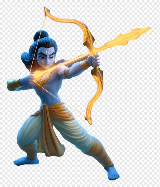 Tags: 3D render Hindu deity Hindu warrior Lord Rama Rama archer blue skin bow and arrow cartoon style character divine epic hero glowing arrow gold details heroism mythological spiritual stylized art traditional attire transparent PNG