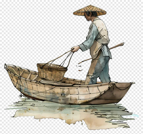 Tags: Asian fisherman East Asian Southeast Asian conical hat cultural heritage fishing basket folk art free download river scene rustic sketch art straw hat traditional boatman traditional clothing tranquil transparent PNG water reflection watercolor illustration wooden boat