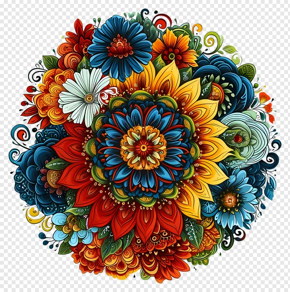 Immerse yourself in the stunning beauty of this vibrant floral mandala PNG. This intricate, colorful illustration features a rich bouquet of stylized flowers and leaves in shades of red, orange, yellow, blue, and green, all meticulously arranged in a circular design against a striking black background. Perfect for adding a touch of elegance and artistic flair to your creative projects. Download this high-quality, free PNG image now for digital art, graphic design, invitations, presentations, or unique decor. Unleash your creativity with this beautiful botanical artwork!
