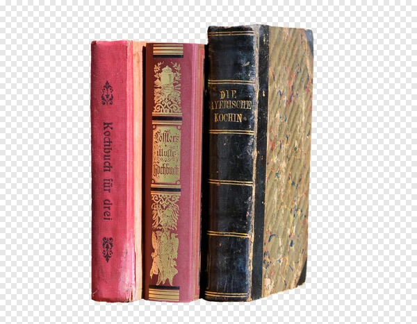 Download this high-quality free PNG image featuring a charming stack of three vintage German cookbooks, perfect for projects needing an antique, culinary, or literary touch. The collection includes titles like 'Kochbuch für drei', 'Tofflers illustr. Kochbuch' with ornate gold designs, and 'Die Bayerische Kochin' featuring a unique marbled cover. These aged, worn books evoke a sense of history and traditional cooking. Ideal for website graphics, educational materials, blog posts on food history, digital scrapbooking, or adding an authentic old-world feel to your designs. Get this transparent background asset now for free!