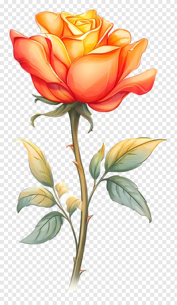 Download this beautiful watercolor-style rose flower PNG for free! Featuring vibrant orange and yellow petals with delicate green leaves, this high-quality image is perfect for graphic design, scrapbooking, wedding invitations, and more. Use it to add a touch of elegance and natural beauty to your projects. Transparent background for easy integration. Get your free download now!