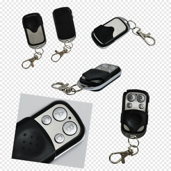 Unlock convenience and security with this high-quality Free PNG of a Wireless Remote Control Key Fob! This versatile image showcases multiple angles of a sleek black and silver universal remote, featuring distinct A, B, C, D buttons and a robust keychain clip. Ideal for garage door openers, gate access systems, home security, or various smart devices, this transparent PNG is perfect for web design, product mockups, presentations, or DIY project guides. Download this professional, isolated asset for free to seamlessly integrate into any creative project, adding a touch of modern technology and reliable access control.