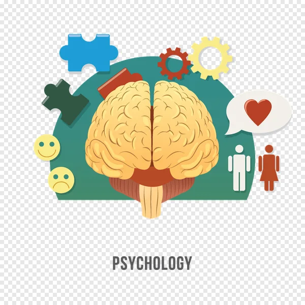 Explore the complexities of the human mind with this vibrant psychology brain illustration, perfect for educational and conceptual projects. This high-quality PNG image visually represents various aspects of human experience, featuring a detailed brain surrounded by icons like puzzle pieces for problem-solving, gears for thought mechanisms, happy and sad emojis for emotions, a heart speech bubble for feelings and communication, and male and female figures for relationships. Ideal for presentations on mental health, cognitive science, emotional intelligence, psychological research, or any graphic design needing a clear and engaging visual of the brain's functions and human interaction. Download this transparent, free PNG to enhance your website, academic materials, or awareness campaigns.