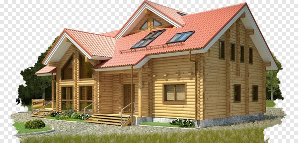 Download this exquisite PNG image of a rustic log house, perfect for architectural visualizations, real estate listings, or any home design project. This charming wooden country home features a distinctive reddish-orange tiled roof with multiple gables and modern skylights, robust log construction, and inviting front steps with railings. Lush green landscaping and a paved path complement its warm aesthetic. The transparent background makes it easy to integrate into your creative compositions. Get this high-quality log cabin PNG for free and bring a touch of natural elegance to your next design.