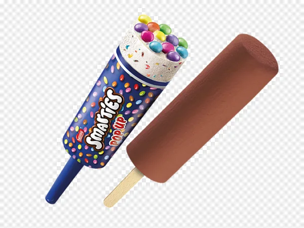 Indulge in the vibrant fun of summer with this free PNG image featuring two delightful frozen treats! Download the iconic Nestlé Smarties Pop Up ice cream, bursting with colorful Smarties candies and sprinkles on a blue wrapper and stick. Alongside it, you'll find a classic, rich chocolate ice cream bar on a natural wooden stick, offering a smooth, tempting texture. Perfect for food blogs, graphic design projects, menu designs, advertisements, or any creative endeavor needing high-quality dessert visuals. Get your transparent background PNG now and add a sweet touch to your designs – no attribution required!