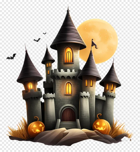 Download this high-quality free PNG image of a spooky Halloween castle, perfect for adding a haunting touch to your projects! Featuring a grand castle illuminated by a radiant full moon, flying bats, and cheerfully glowing jack-o'-lanterns, this illustration captures the essence of a mysterious Halloween night. Ideal for party invitations, digital art, website banners, or festive decorations. Get your transparent background castle graphic today and create enchanting, eerie designs with ease. A must-have for Halloween enthusiasts!
