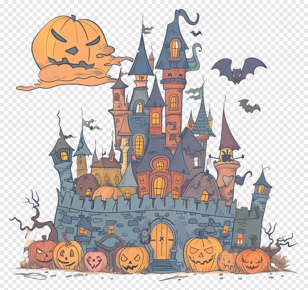 Download this enchanting and spooky Halloween castle PNG for free! This whimsical illustration features a towering haunted mansion glowing with warm light, overshadowed by a giant, menacing jack-o'-lantern moon. Bats fly across the dark sky, and a collection of grinning pumpkins decorates the castle's base, adding to the eerie charm. Perfect for adding a festive touch to your Halloween invitations, digital art projects, trick-or-treat banners, website decor, or seasonal crafts. Get this high-quality transparent PNG and bring your spooky designs to life instantly!