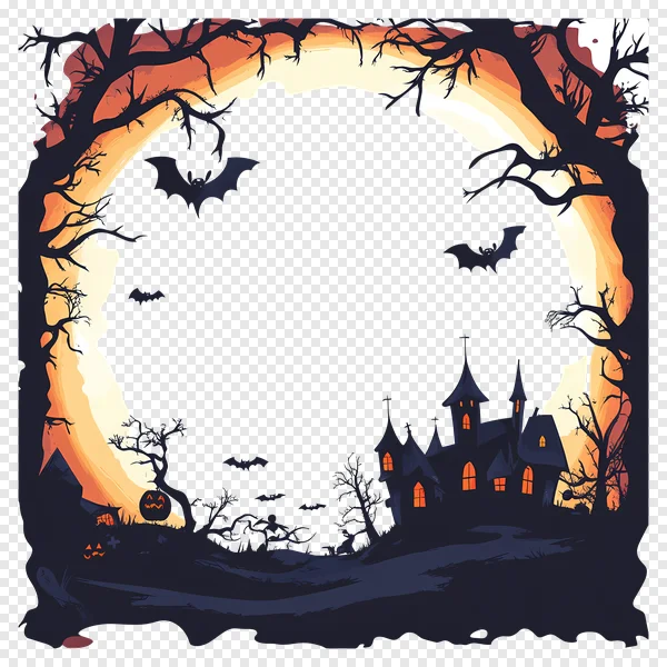 Set the perfect spooky mood with our free Halloween Haunted House & Full Moon Frame PNG! This captivating image features a silhouetted haunted mansion with glowing orange windows, flying bats, and bare, gnarled trees framing a mystical full moon. Below, subtle jack-o'-lanterns and gravestones complete the eerie night scene. Ideal for creating chilling Halloween party invitations, spooky social media posts, frightening flyers, website banners, or any creative project needing an eerie touch. Download this high-quality, transparent background PNG for free to add a truly haunting border to your designs this holiday season. Perfect for graphic designers, event planners, and DIY enthusiasts. Get yours now and let the spooky fun begin!