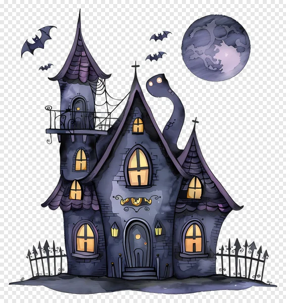 Unleash the spirit of Halloween with our captivating free PNG of a spooky haunted house. This unique cartoon illustration features a mysterious mansion under a glowing full moon, with eerie bats circling overhead and bright, inviting lights shining from its windows. Adorned with gothic architecture, pointed roofs, a quaint balcony, and a creepy fence, this high-quality image boasts a transparent background, making it perfect for your Halloween party invitations, digital designs, festive decorations, or any project needing a touch of ghoulish charm. Download this watercolor-style, creepy yet charming graphic instantly for personal and commercial use!