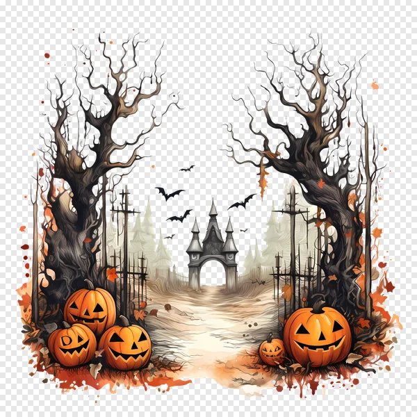 Tags: Halloween Halloween illustration Jack-o'-lantern autumn leaves bare trees bats celebration cemetery creepy dark fantasy digital art fall graveyard haunted haunted castle holiday pumpkin spooky spooky season transparent PNG twisted trees