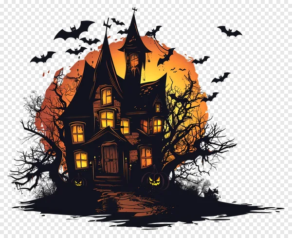 Dive into the spooky spirit with our free, high-quality PNG of a classic haunted house illustration. Featuring a dark silhouette against an eerie orange moon, flying bats, gnarled bare trees, and glowing jack-o'-lanterns, this image perfectly captures the essence of Halloween night. Ideal for crafting unique party invitations, festive decorations, digital backgrounds, social media graphics, or any creative project needing a touch of mysterious charm. Download this atmospheric graphic with a transparent background instantly!