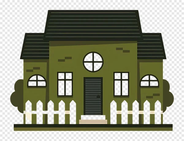 Download this unique free PNG of a spooky olive green cartoon house, perfect for adding an eerie touch to your creative projects. This stylized home illustration features a dark olive green facade, mysterious black windows with a distinctive circular attic window, a dark grey slatted front door, and a charming picket fence flanked by shadowy bushes. The transparent background ensures seamless integration into any design, making it ideal for graphic design, digital art, social media posts, Halloween party invitations, spooky game assets, website banners, or educational materials. Get your high-quality, free download today and bring your eerie visions to life with this versatile and captivating image!