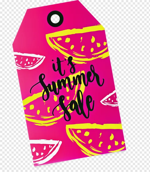 Download this vibrant, high-quality 'It's Summer Sale' tag PNG for free! Featuring cheerful watermelon slices and a bright pink background, this image is perfect for summer promotions, retail displays, gift tags, social media graphics, and more. Instantly add a fresh, seasonal touch to your marketing materials. Transparent background for easy integration into your designs. Get your free download now!