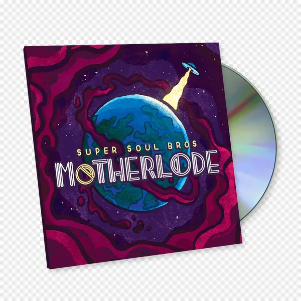 Explore the captivating cosmic artwork of the 'Super Soul Bros Motherlode' album cover, available as a high-quality free PNG download. This vibrant illustration features a stunning blue Earth set against a dark starry sky, encircled by rich purple and red nebulous clouds. A classic UFO emits a bright yellow beam, adding a touch of retro sci-fi mystery. Perfect for music enthusiasts, graphic designers, or anyone seeking unique space-themed visuals. Enhance your projects with this eye-catching, detailed CD art by Jon Massam. Download this free transparent PNG image now to add an artistic and soulful vibe to your creative work, presentations, or digital collections.