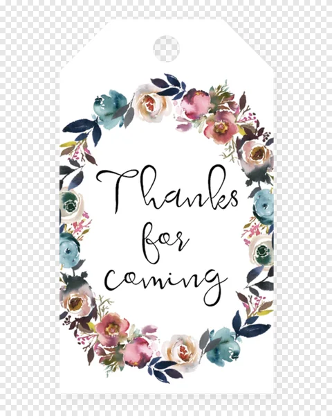 Download this beautiful 'Thanks for Coming' tag PNG for free! Perfect for party favors, wedding gifts, event decorations, or thank you notes. This elegant watercolor floral design features a wreath of roses, leaves, and delicate blooms. Use it to add a personal touch to your projects – instantly downloadable and ready to use! High-resolution and transparent background for easy integration into your designs. Get your free PNG now!