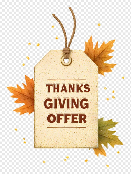Elevate your holiday marketing with this eye-catching, free Thanksgiving Offer Tag PNG. This transparent image features a rustic, textured paper tag adorned with vibrant autumn maple leaves in warm orange and yellow hues, tied with a natural twine rope. Scattered golden specks add a festive touch. Perfect for announcing special Thanksgiving sales, discounts, and promotions on social media, websites, banners, flyers, or any fall-themed advertisement. Download this high-quality, ready-to-use graphic today to enhance your seasonal campaigns and attract customers with compelling holiday deals!