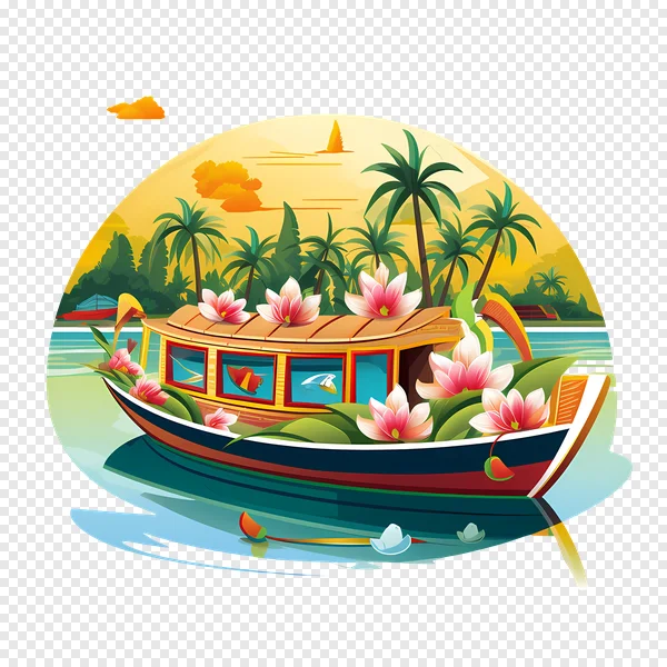 Embark on a visual journey with this captivating free PNG download featuring a beautifully decorated traditional houseboat. Adorned with vibrant pink lotus flowers, this serene boat floats gracefully on calm, turquoise waters, surrounded by lush tropical palm trees and a picturesque golden sunset sky. Perfect for conveying themes of relaxation, exotic travel, or natural beauty, this high-quality vector illustration is ideal for your design projects, websites, presentations, or travel blogs. Download this stunning tropical backwaters image for free and add an essence of tranquility to your creative work today!