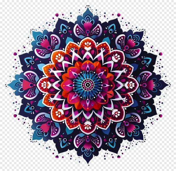 Unleash creativity with this stunning free PNG of a vibrant floral mandala! This intricate ornamental design features a dazzling array of rich blues, striking pinks, fiery oranges, and subtle whites, all set against a dramatic black background. Its layered, almost 3D aesthetic and precise symmetry make it a captivating visual asset. Perfect for graphic designers, digital artists, or anyone seeking a unique element for spiritual themes, cultural projects, meditation apps, website backgrounds, social media posts, or print designs. Enhance your projects with this high-quality, eye-catching psychedelic art. Download now and add a touch of colorful elegance to your work!