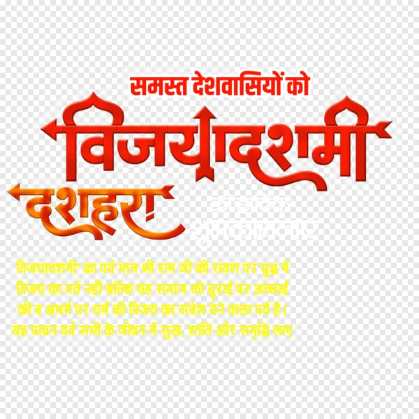 Celebrate the spirit of good over evil with our high-quality Free Vijayadashami Dussehra Shubhkamnaye PNG image. This vibrant Hindi greeting features 'समस्त देशवासियों को विजयदशमी दशहरा की हार्दिक शुभकामनाएँ' (Hearty wishes of Vijayadashami Dussehra to all countrymen) and explains the festival's essence as Lord Rama's victory over Ravana. Download this transparent PNG for your social media posts, greeting cards, or festive designs to spread wishes of happiness, peace, and prosperity this auspicious season. Perfect for digital projects and personal messages.