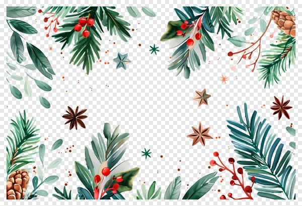Download this enchanting free watercolor Christmas border PNG, perfect for adding a touch of festive elegance to your projects. This high-quality image features beautifully hand-painted green fir branches, vibrant red holly berries, rustic pinecones, and charming star anise, all artfully arranged to create a captivating frame. With its transparent background, it's ideal for greeting cards, invitations, social media graphics, banners, and other winter holiday designs. Infuse your creations with seasonal cheer and natural beauty. Get your transparent PNG for free today!
