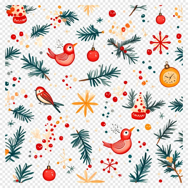 Download this enchanting free PNG image featuring a seamless whimsical Christmas pattern. Adorned with charming hand-drawn red winter birds, lush green pine branches, bright red berries, sparkling snowflakes, and festive ornaments on a deep black background. Perfect for holiday digital paper, DIY crafts, scrapbooking, invitations, greeting cards, website backgrounds, or textile designs. Add a touch of festive cheer to your projects instantly. High-quality, transparent background for easy use. Get your free Christmas pattern PNG today!