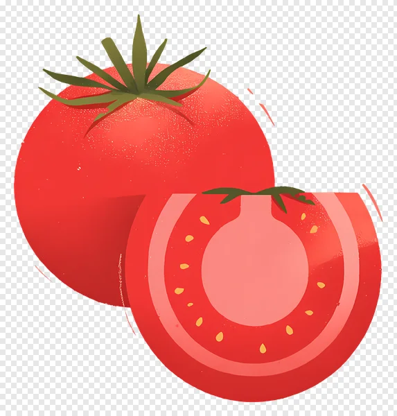 Download this high-quality, free PNG image of a fresh red tomato, perfect for your culinary and design projects! This vibrant illustration features both a complete, ripe tomato with its green stem and a neatly sliced half, showcasing its juicy interior and distinct seeds. With a transparent background, it's ideal for adding a healthy, garden-fresh touch to websites, blogs, menus, recipe cards, healthy eating campaigns, or educational content. Get your versatile food clipart today!