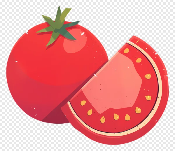 Download this vibrant, high-quality PNG image featuring a perfectly ripe, red tomato. The illustration includes a whole tomato with its green stem and a juicy, detailed slice revealing bright yellow seeds. Ideal for food blogs, cooking recipes, healthy lifestyle content, educational materials, or adding a fresh pop to your designs. With its transparent background, this delightful cartoon-style tomato is ready for any project. Get your free download today!