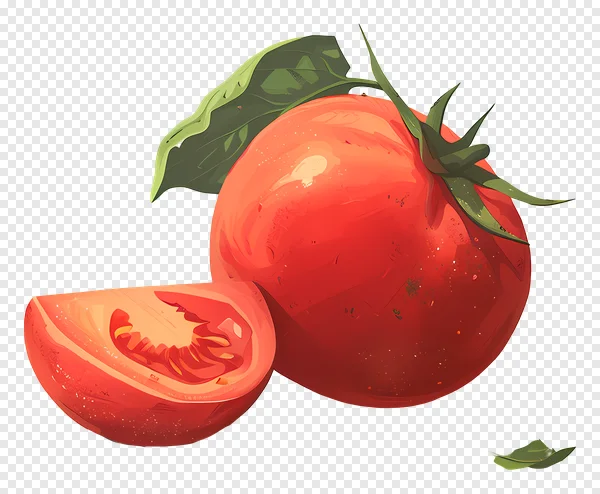 Download this vibrant, high-quality free PNG of a fresh red tomato and a perfect slice, featuring natural green leaves and a stem, all with a transparent background. This juicy, stylized illustration is ideal for graphic designers, food bloggers, chefs, or anyone needing eye-catching culinary visuals. Enhance your menus, recipe cards, marketing materials, healthy eating content, or educational projects. Get this versatile, ready-to-use vegetable clipart for free and add a delicious, healthy touch to your creations today!