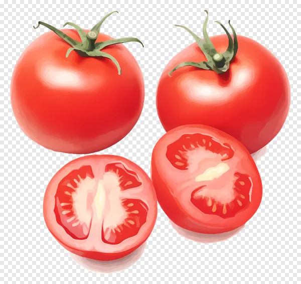 Enhance your culinary designs or healthy eating content with this vibrant PNG image of fresh red tomatoes. Featuring two whole, juicy tomatoes with green stems and two perfectly sliced halves revealing their succulent interior, all on a transparent background. Ideal for food blogs, recipe websites, restaurant menus, grocery ads, or any project needing high-quality vegetable visuals. Download this delicious, high-resolution tomato PNG for free and add a touch of freshness to your next creation!