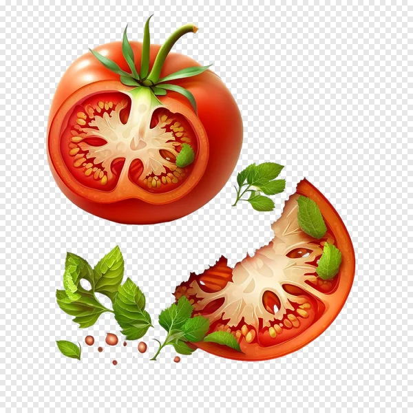 Download this high-quality free PNG image showcasing vibrant red sliced tomatoes, including a detailed cross-section of a whole tomato and a fresh-looking bitten slice. Adorned with lush green basil or mint leaves and subtle spice sprinkles, this transparent background graphic is perfect for enhancing food blogs, recipe cards, restaurant menus, healthy eating promotions, cooking video overlays, and various culinary design projects. Bring a burst of natural freshness and appetizing appeal to your digital creations. Get your free transparent tomato PNG now!