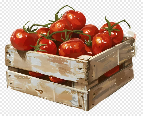 Download this high-quality PNG image of ripe, red tomatoes overflowing from a rustic wooden crate! Perfect for food blogs, recipe websites, farmers market designs, or any project needing a touch of fresh produce. This transparent background PNG is free to use for personal and commercial projects. Enhance your visuals with this vibrant and detailed tomato illustration. Get your free download now!