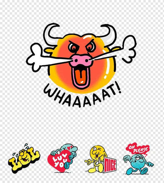 Download this hilarious cartoon bull PNG image for free! Featuring a surprised bull with a comical "Whaaaat?!" expression and accompanying cute sticker designs like 'LOL', 'Love You', 'Nice', and 'Oh Please'. Perfect for adding a playful touch to your designs, social media posts, or digital art projects. High-quality, transparent background for easy integration. Get your free download now!