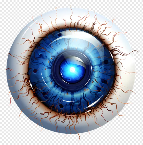 Download this striking futuristic blue cyborg eye PNG image for free! Featuring a vibrant blue iris with intricate, almost circuit-like patterns, a glowing pupil reminiscent of a camera lens, and detailed red-orange veins on a translucent sclera. This high-quality, transparent digital eyeball is perfect for sci-fi themes, technology concepts, gaming graphics, web design, presentations, and any project needing a powerful visual of advanced vision, surveillance, or AI. Enhance your creative works with this unique, compelling graphic. Available for instant free download!