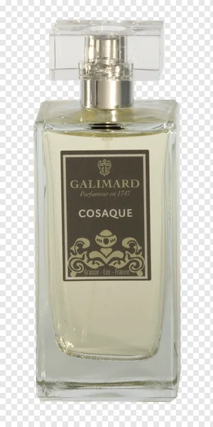 Discover the elegance of French perfumery with this high-quality, free PNG download of a Galimard COSAQUE perfume bottle. This sophisticated image features a classic square glass bottle with a clear cap and a shimmering silver spray mechanism, filled with a light amber liquid. The distinctive dark label proudly displays 'Galimard Parfumeur en 1747', 'COSAQUE', and 'Grasse - Eze - France', along with an ornate crest. Perfect for beauty blogs, e-commerce product showcases, graphic design projects, or creating stunning mockups, this image offers a transparent background for easy integration. Enhance your creative work instantly – download this exquisite perfume bottle PNG today for free!